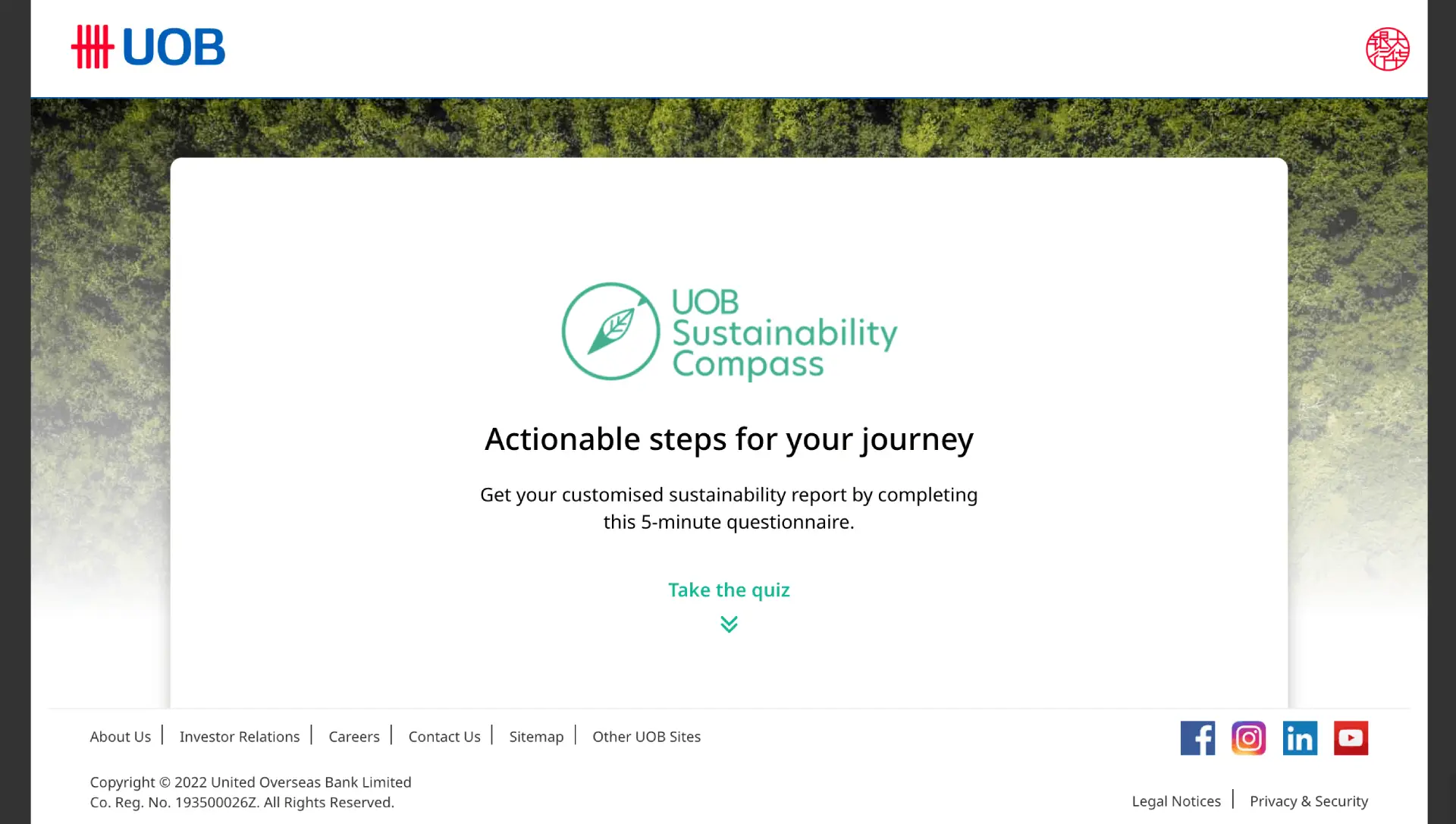 I was tasked by UOB to create a questionnaire micro-site that enables UOB to collect information from its business banking clients and make recommendations on how they can best adapt to a zero-carbon future, including suggestions on how to reduce their carbon footprint.