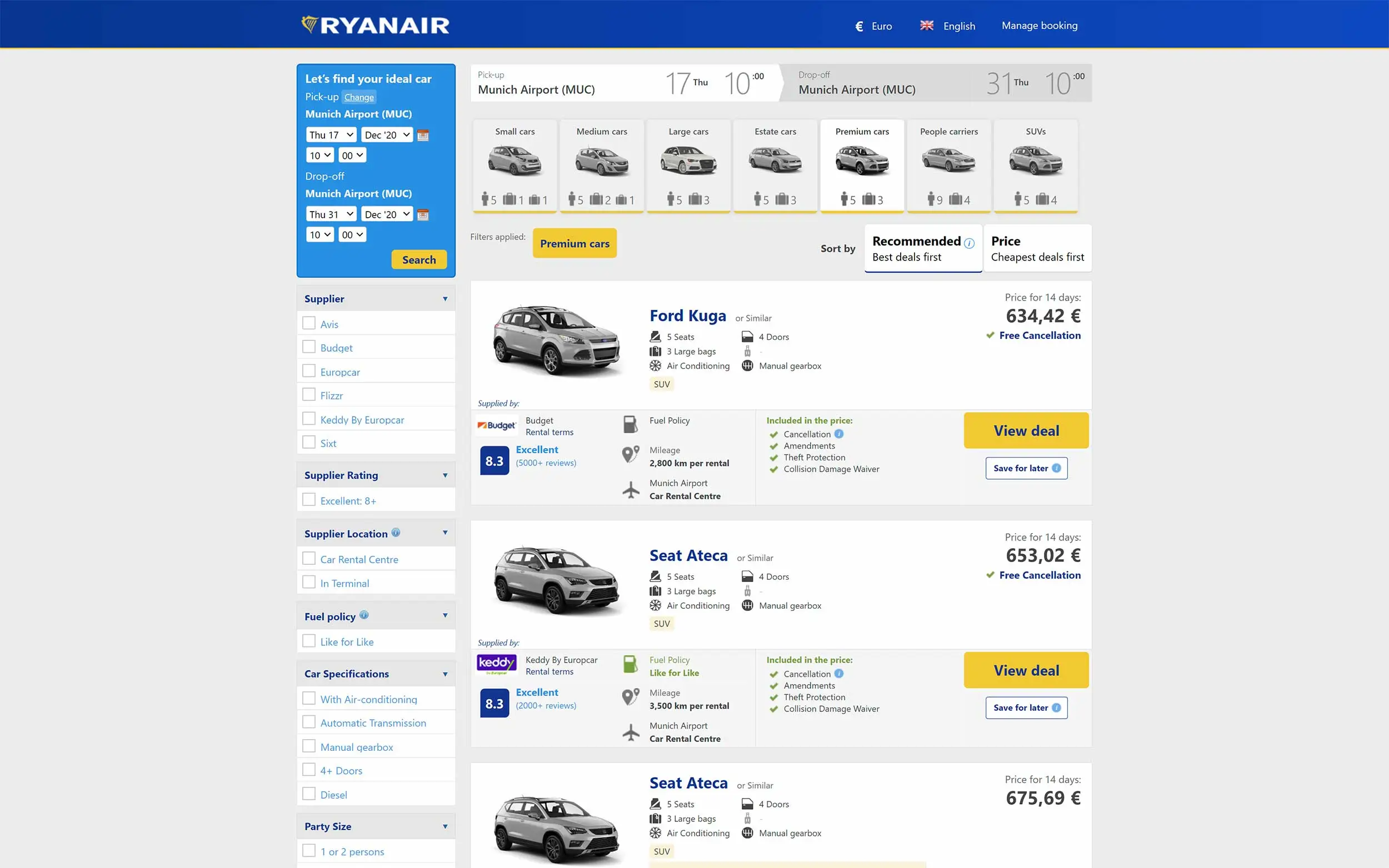Booking.com provides RyanAir's Car Hire stage of the user experience. My role was to support and aid the development of the UI that facilitates the search and selection of hire cars and help integrate that into the API provided by RyanAir.