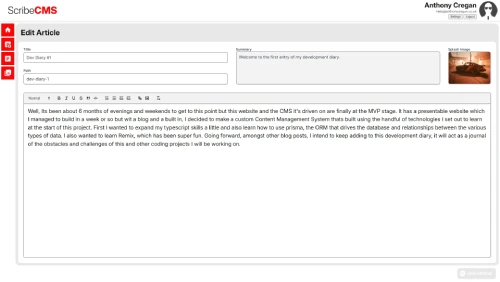 In order to create and manage articles on the TDCbitworks.co.uk site I needed a content management system. The creation of this app, which I have since named Scribe CMS, was a challenging project that I thoroughly enjoyed developing.