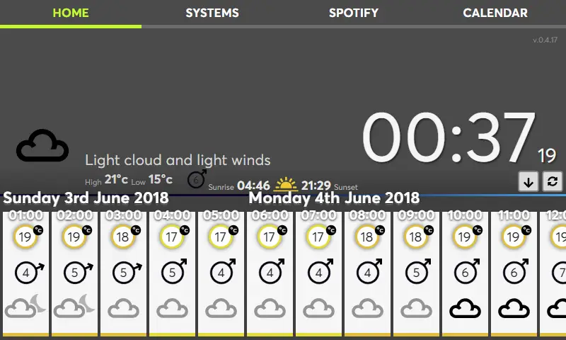 Built on NodeJS and running on a Raspberry Pi SoC board connected to a touchscreen display, this project enables the user to get the weather forecast, control spotify music and playlists, view and edit their calendar with reminders and also control and monitor IoT lighting throughout the house.